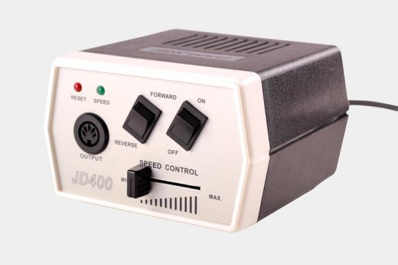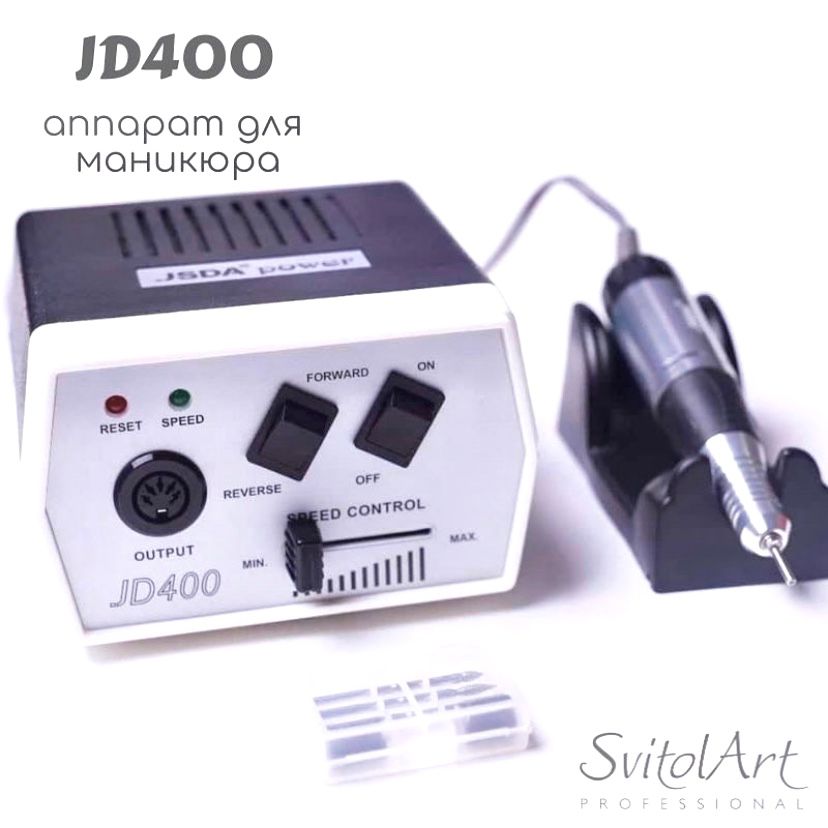 Профессиональный фрезер для маникюра и педикюра JD-400 с комплектом насадок для маникюра, педикюра, а также коррекции нарощенных ногтей, скорость до 30000 об. /мин. Работает от розетки, очень прост в эксплуатации, есть микропроцессорный регулятор скорости и реверс. Удобное гнездо для рукоятки уберегает от повреждений.