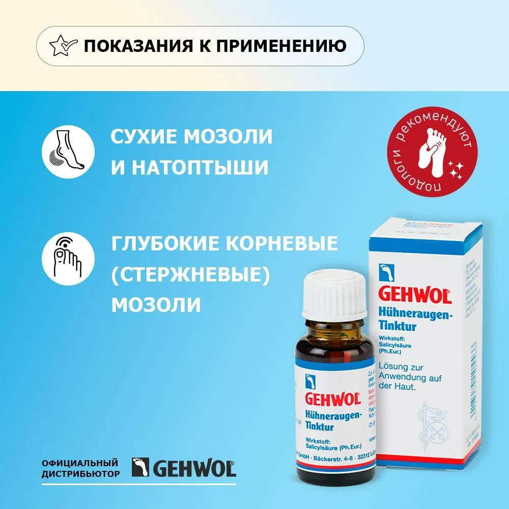 1-2 капли настойки наносятся на хорошо высушенные участки кожи. Процедура проводится 2 раза в день в течение 4 дней. Размягченные участки грубой кожи или мозоли легко удаляются пемзой после ванны. После высверливания мозолей при аппаратном педикюре 2-3 капли настойки наносятся на место удаленного корня мозоли. Для аппликации настойки, чтобы защитить участки здоровой кожи вокруг, используйте «Мозольный пластырь» марки GEHWOL.