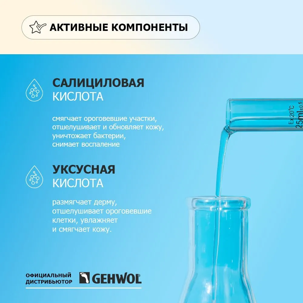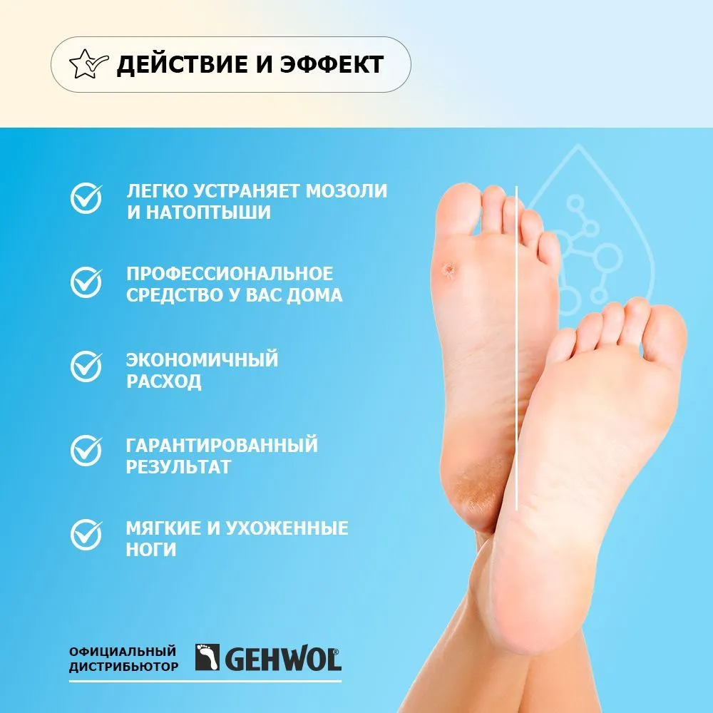 Высококонцентрированное средство с сильным проникающим действием. Используется для устранения мозолей и загрубевшей кожи. Средство особенно эффективно при удалении поверхностных мозолей и натоптышей. При более глубоком корне мозолей средство эффективно при их высверливании в процессе аппаратного педикюра.