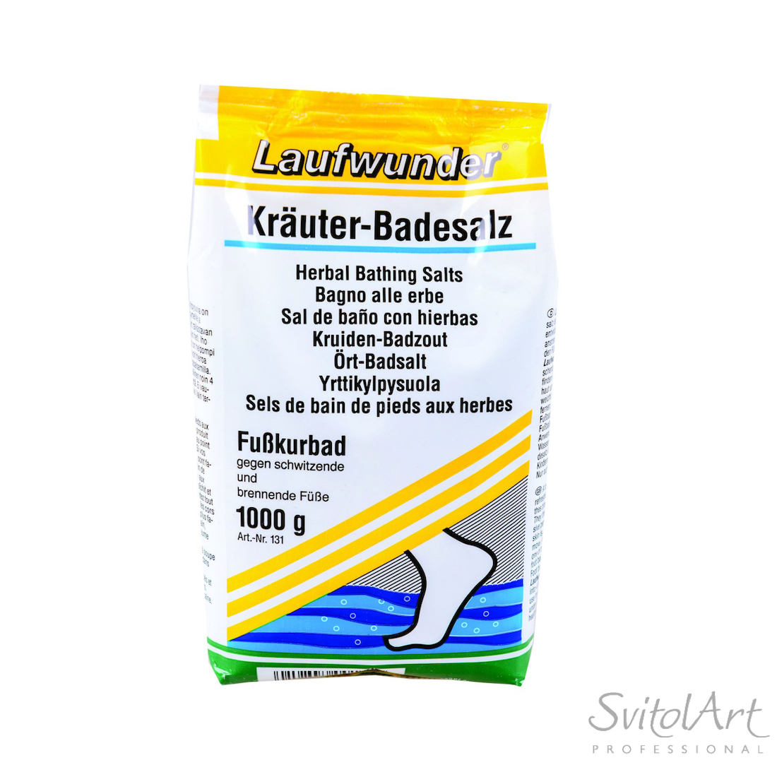 Соль для ванн с экстрактами трав снимает ощущение усталости, тяжести и боли в ногах, значительно снижает потоотделение. Благодаря специально подобранным экстрактам из трав, входящих в состав соли, оказывают укрепляющее и освежающее действие на ноги. После ванны рекомендуется воспользоваться смягчающим бальзамом из серии Laufwunder.